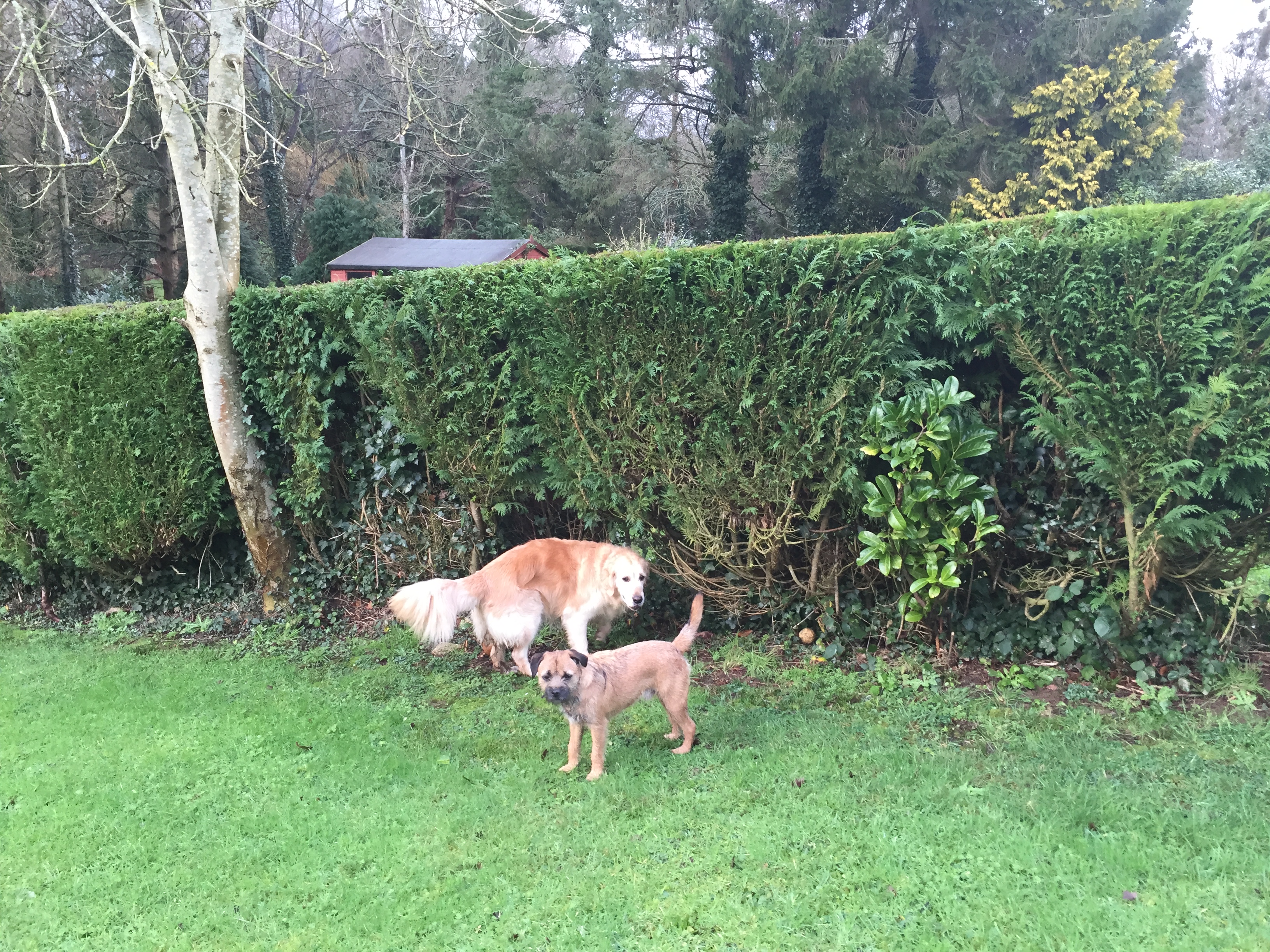 Charlie, abandoning his ball, has come to investigate. Thinking to follow me, he begins burrowing further down in the hedgerow and to my chagrin, gets to the other side in record time. I make a concerted effort. My head breaks through a tangle of branches only to encounter more of the same. My body strains against the wood and briar that seem to be pinning it to the spot. This is not so easy as I first supposed. I am about to give up and retreat when I realise — I am stuck.