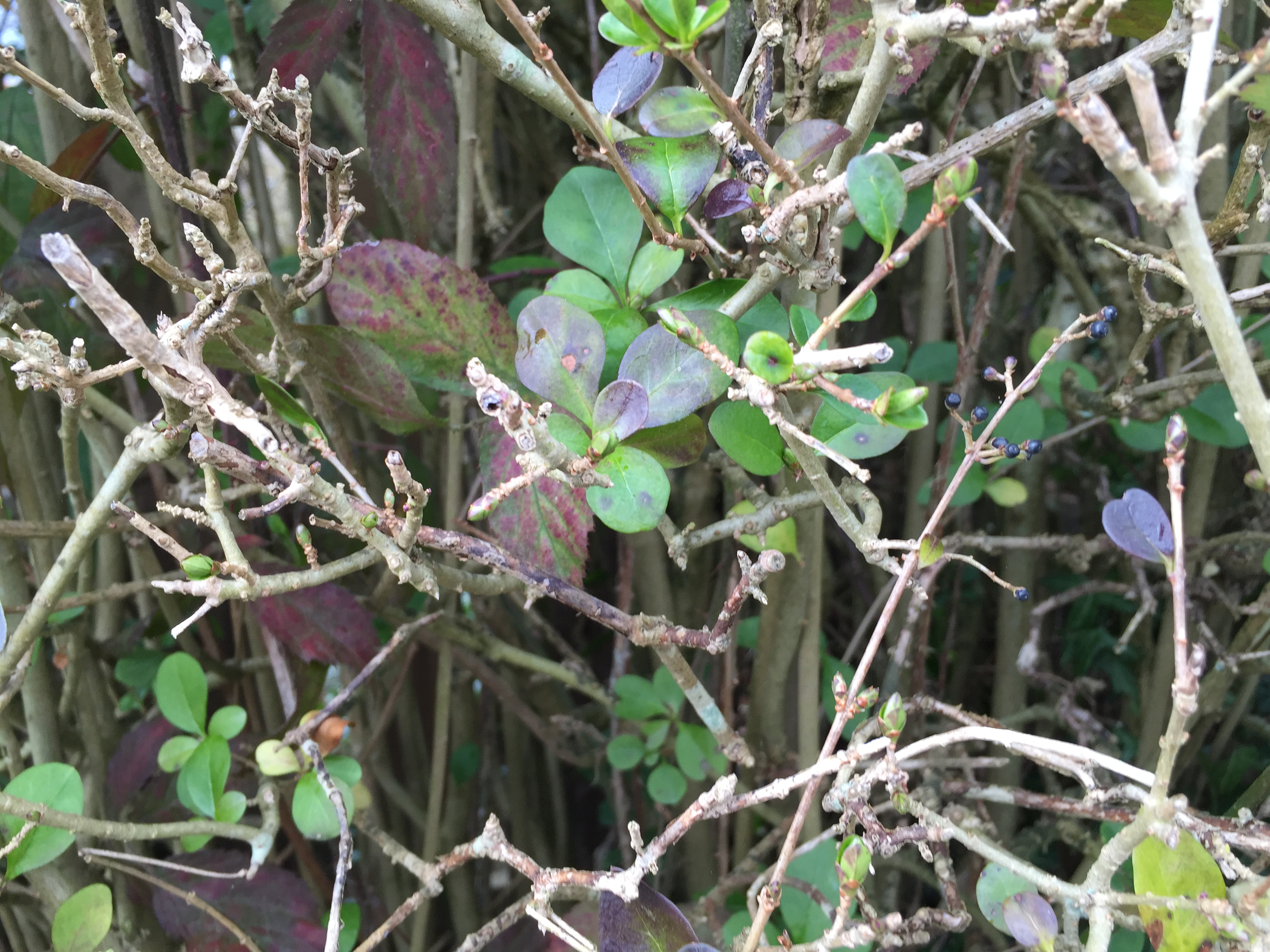 The front hedge is particularly dense, I should explain. Had I known just how dense, I might never have embarked on this mode of escape. As things are, I think I can squeeze between those branches and I know the road is on the other side.
