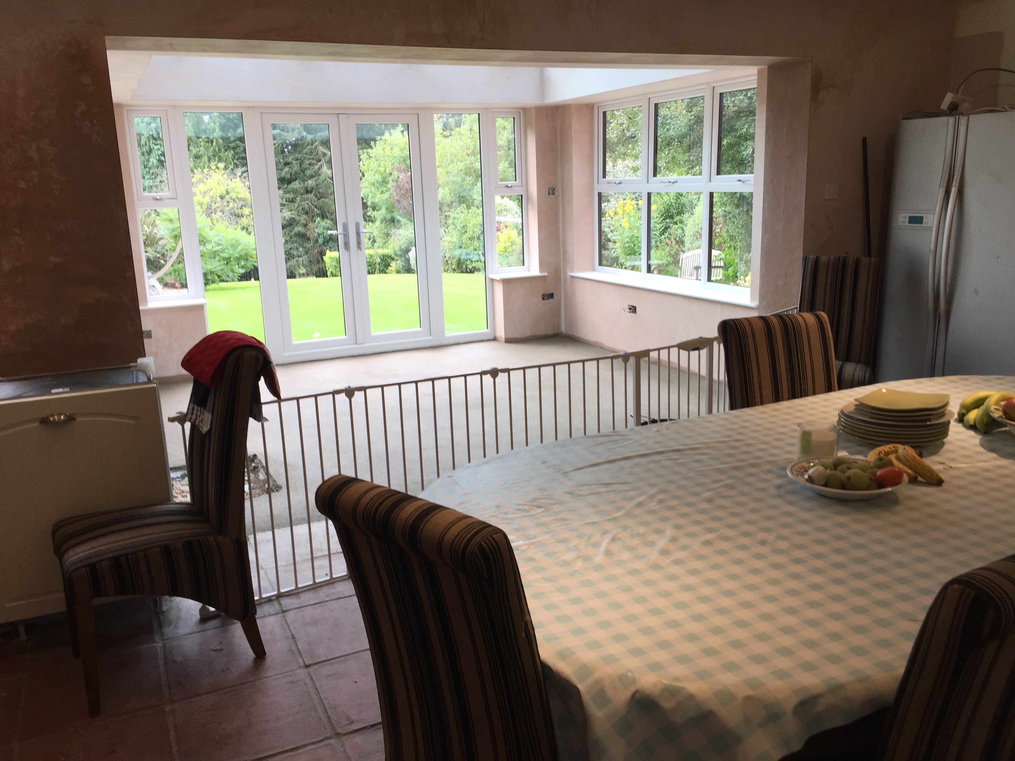 It is 11.30am. The dogs have been fed. They have had to be kept away from the kitchen area today, while the orangery floor is being screeded. A playpen/room divider, bought for use with the grandchildren, provides an excellent barrier as you can see.